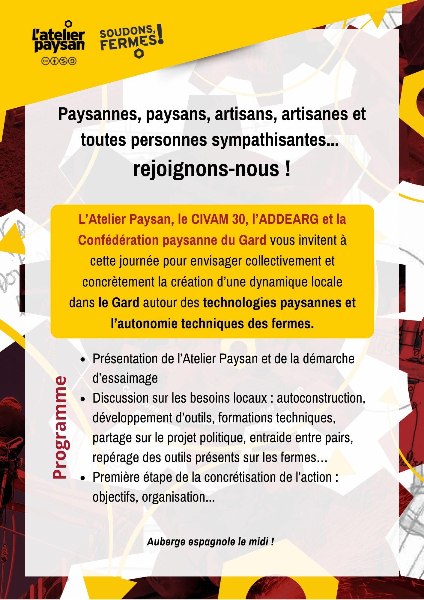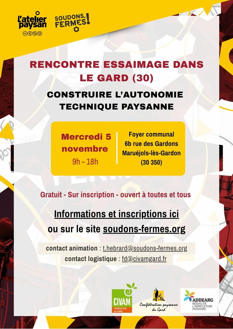 L’Atelier Paysan, l’ Addearg Gard, la Conf’ paysanne Gard, la Fédération Départementale des CIVAM du Gard vous invitent à cette journée du 05 novembre, pour construire l’autonomie technique paysanne.
