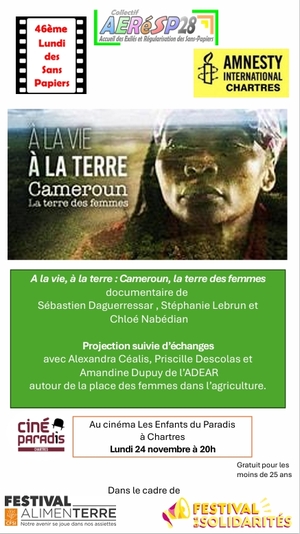 Projection du film documentaire À la vie, à la terre : Cameroun, la terre des femmes (Cinéma Les Enfants du Paradis, Chartres, à 20 heures. (…)