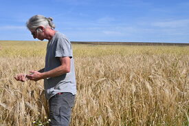 Cette année mes céréales paysannes s’inscrivent après une féverole, sur des sols argileux. Je n’observe pas de problème de verse sur l’orge et seulement quelques cas sur les blés, jugés raisonnables. Mon objectif de rendement tourne autour de 35 quintaux par hectare, dans une rotation longue.