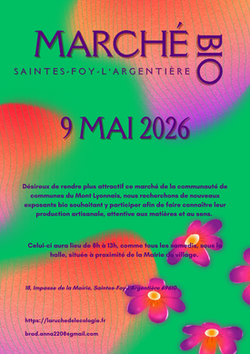 Désireux de rendre plus attractif ce marché de la communauté de communes des Monts du Lyonnais, le marché de Saintes Foy l’Argentière recherche de nouveaux exposants bio souhaitant y participer afin de faire connaître leur production artisanale, attentive aux matières et aux sens.