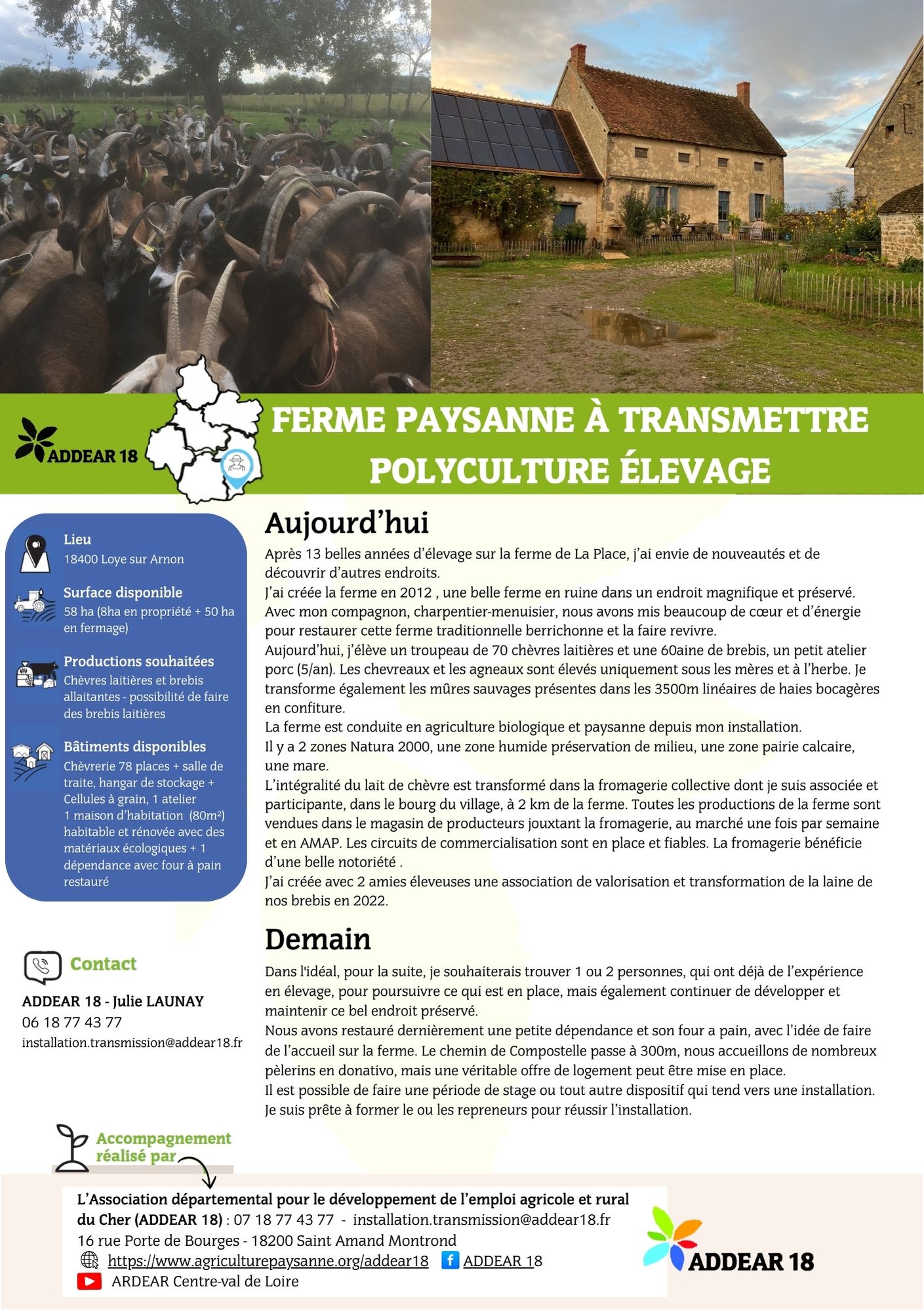 Pour plus d’information sur ces annonces, contactez notre accompagnatrice transmission : Julie LAUNAY, 06 18 77 43 77, installation.transmission@addear18.fr