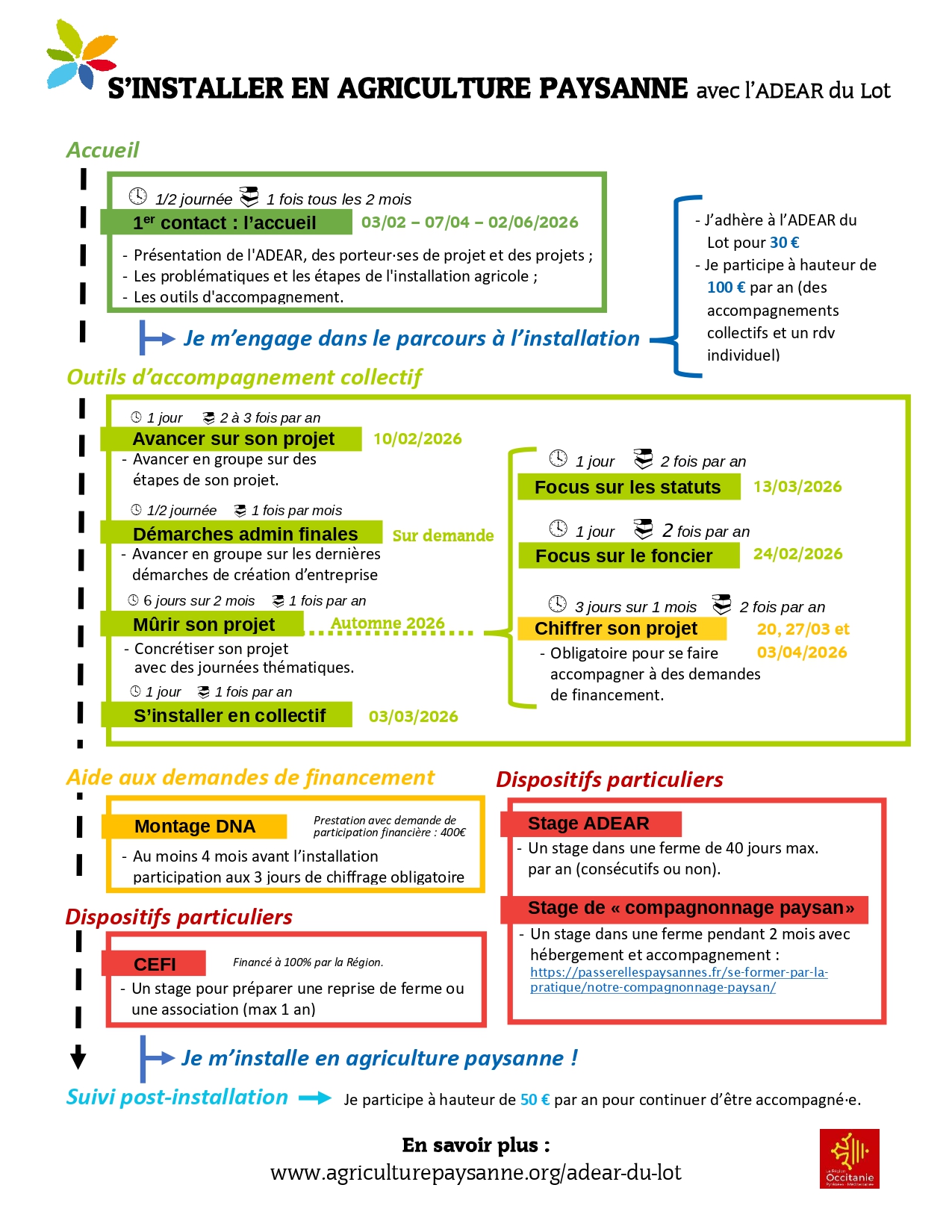Vous pourrez également participer aux formations techniques de l’ADEAR du Lot, avec leurs modalités propres. Elles sont en lien avec le projet d’agriculture paysanne, en réponse à vos besoins particuliers et aux problématiques du moment (les changements de la PAC, les nouveaux statuts, les aides à l’installation, la pluriactivité, les techniques en production animale, végétale...).