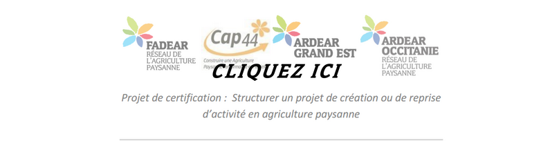 Le projet de certification « Structurer un projet de création ou de reprise d’activité en Agriculture paysanne » permet aux porteurs de projets agricoles de structurer un projet de création ou de reprise d’activité en Agriculture paysanne. Les compétences visées par le projet de certification sont exercées selon les principes de l’Agriculture paysanne qui se décline en six thèmes : autonomie, répartition, transmissibilité, qualité des produits, développement local et le travail avec la nature.