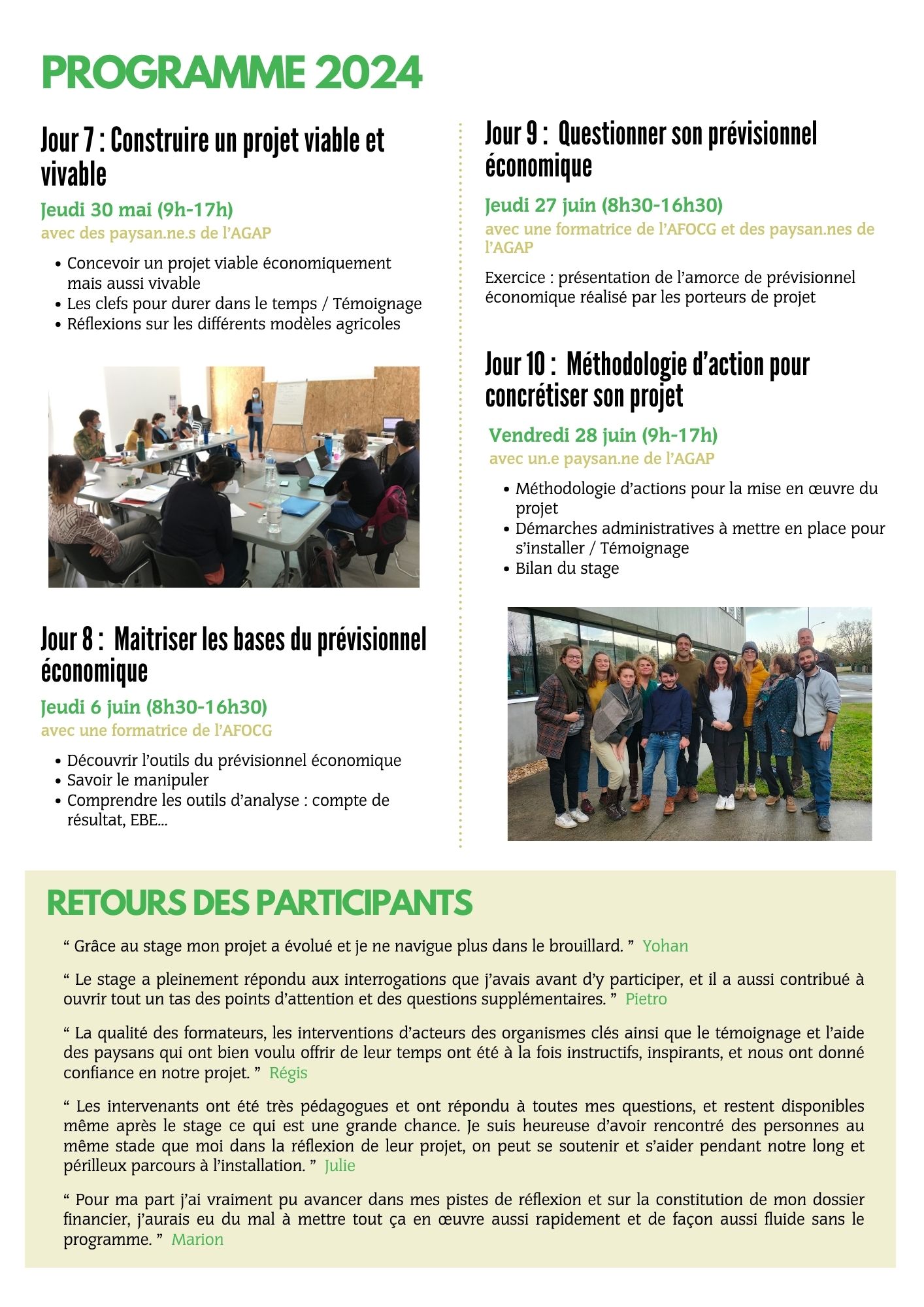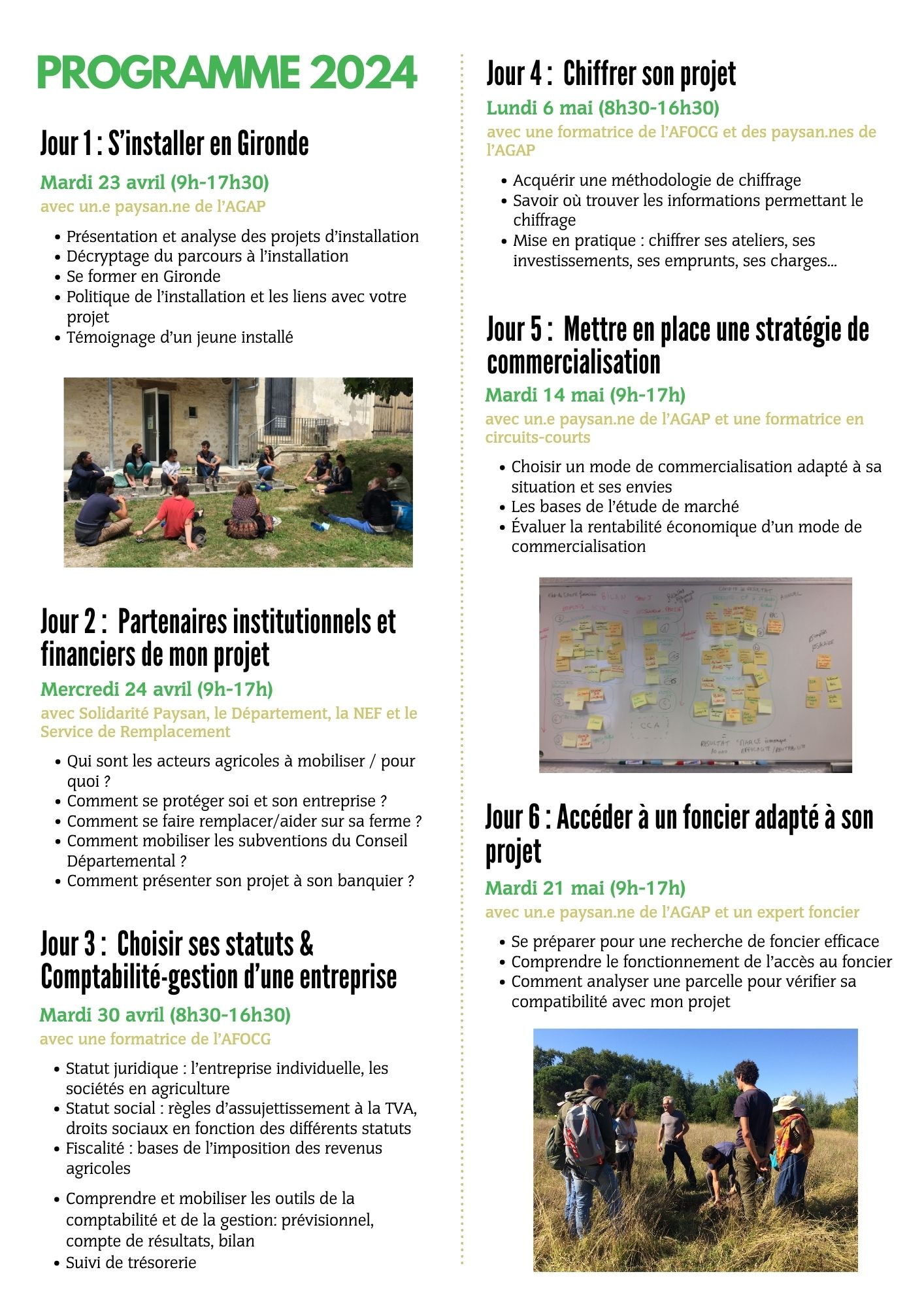 Il s'agit d'une session d'accompagnement de 10 jours, entre avril et juin, qui vous permettra d'appréhender tous les points nécessaires à la définition, précision et création de votre projet agricole.