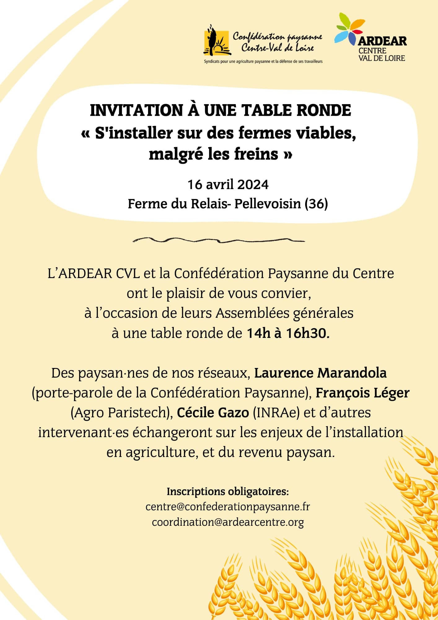 L'Ardear Centre-Val de Loire - Réseau de l'Agriculture Paysanne et la Confédération Paysanne du Centre ont décidé d'organiser une soirée concert et une table-ronde sur deux jours dans l'Indre en avril, pour leurs assemblées générales respectives !