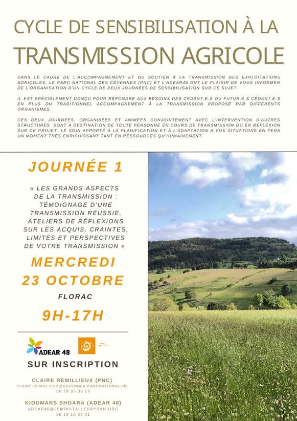 Dans le cadre de l’accompagnement et du soutien à la transmission des exploitations agricoles, le Parc national des Cévennes (PNC) et l’ADEAR 48 ont le plaisir de vous informer de l'organisation d'un cycle de deux journées de sensibilisation sur ce sujet.