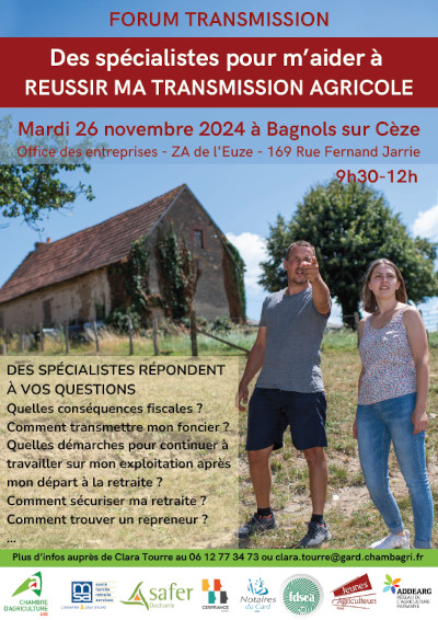 Cette journée à destination des agriculteurs et agricultrices concerné·es par la question de la transmission-reprise est coordonné par la chambre d'agriculture. Il se tiendra à Bagnols-sur-Cèze, ce forum rassemblera différents acteurs intervenant lors des transmissions agricoles : Cer France, chambre d'agriculture, chambre des notaires, MSA, Safer et Addearg.