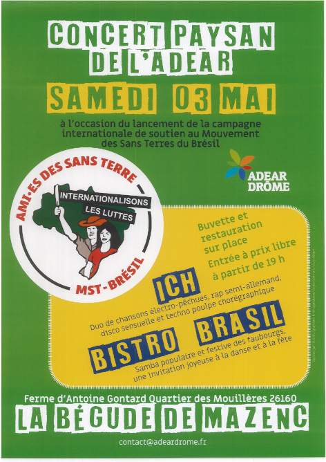 Venez participer au prochain événement de l'Adear Drôme, à l’occasion du lancement de la campagne internationale de soutien au Mouvement des Sans Terres du Brésil !