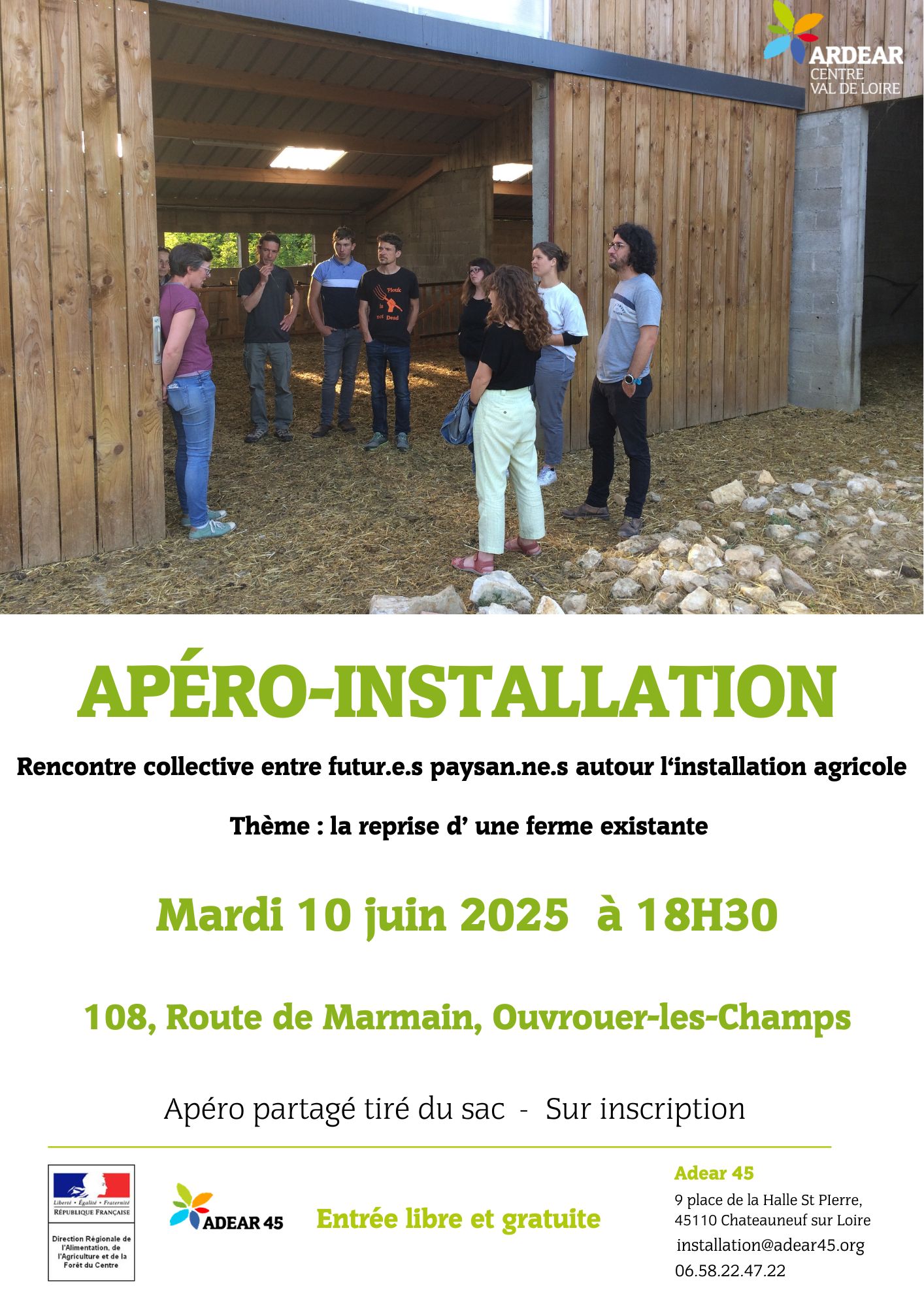 L'Adear45 organise le mardi 10 juin prochain à 18H30 un apéro-installation à destination des porteurs et porteuses de projets agricoles autour de la thématique : s'installer sur une ferme existante.