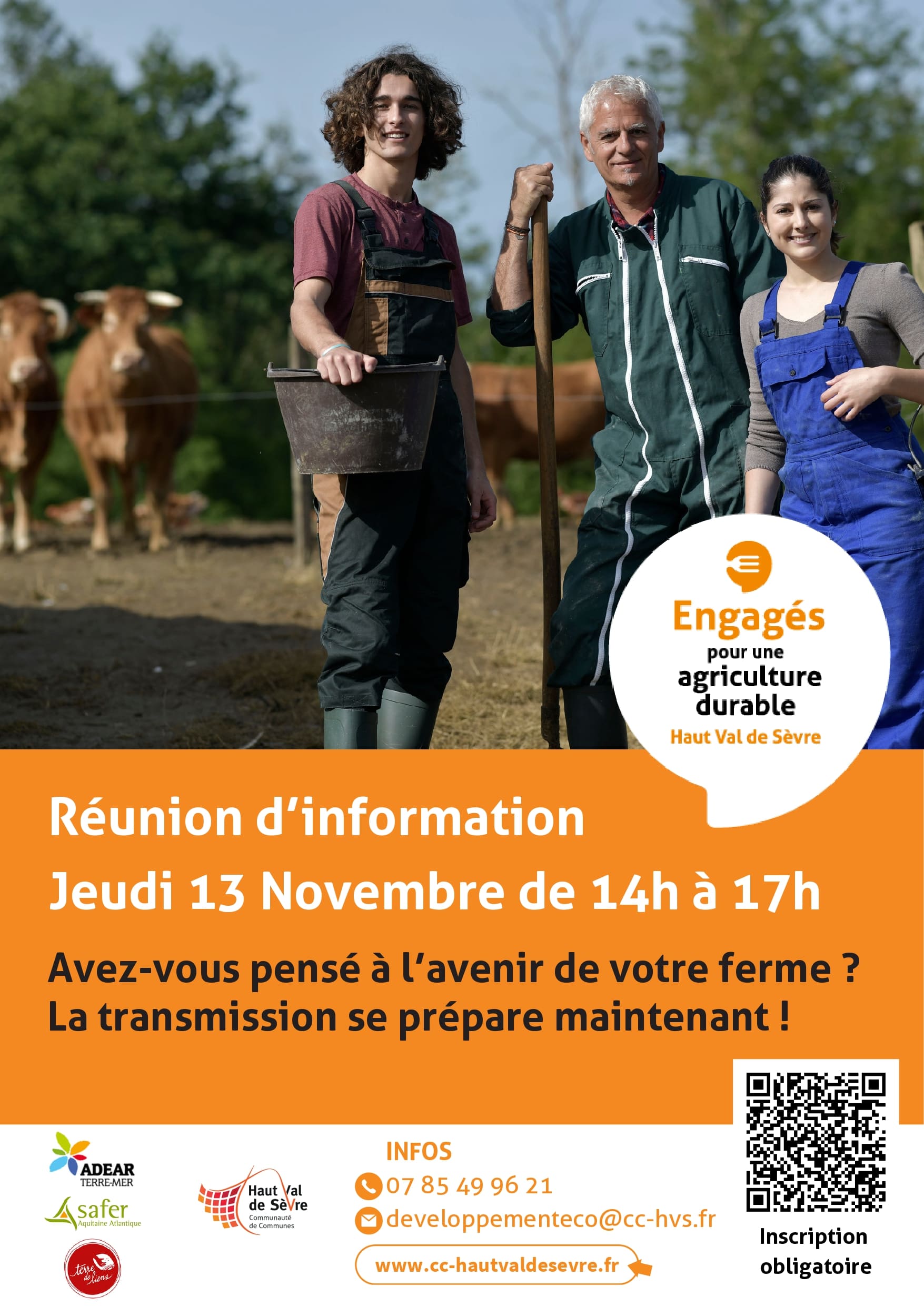 Venez discuter de l'avenir de votre ferme et de la préparation de votre transmission avec nous : Jeudi 13 novembre de 14h à 17h Avec l'intervention de Terre de Liens et de la SAFER Et en partenariat avec la Communauté de Communes Haut Val de Sèvre