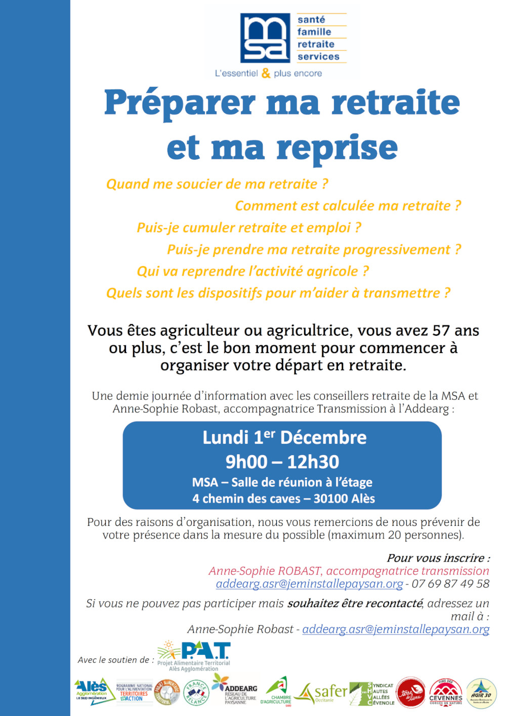 Quand me soucier de ma retraite ? Comment est calculée ma retraite ? Puis-je cumuler retraite et emploi ? Puis-je prendre ma retraite progressivement ? Qui va reprendre l’activité agricole ? Quels sont les dispositifs pour m’aider à transmettre ? Vous êtes agriculteur ou agricultrice, vous avez 57 ans ou plus, c’est le bon moment pour commencer à organiser votre départ en retraite.  Une demie journée d’information avec les conseillers retraite de la MSA et Anne-Sophie Robast, accompagnatrice Transmission à l’Addearg. RDV à la MSA – Salle de réunion à l’étage, 4 chemin des caves – 30100 Alès MATINEE COMPLETE ! D'autres sessions seront prévues en 2026, contactez-nous si vous êtes intéressé.e pour que nous puissions vous inscrire : Anne-Sophie ROBAST, accompagnatrice transmission - addearg.asr@jeminstallepaysan.org - 07 69 87 49 58  Si vous ne pouvez pas participer mais souhaitez être recontacté, adressez nous un mail.
