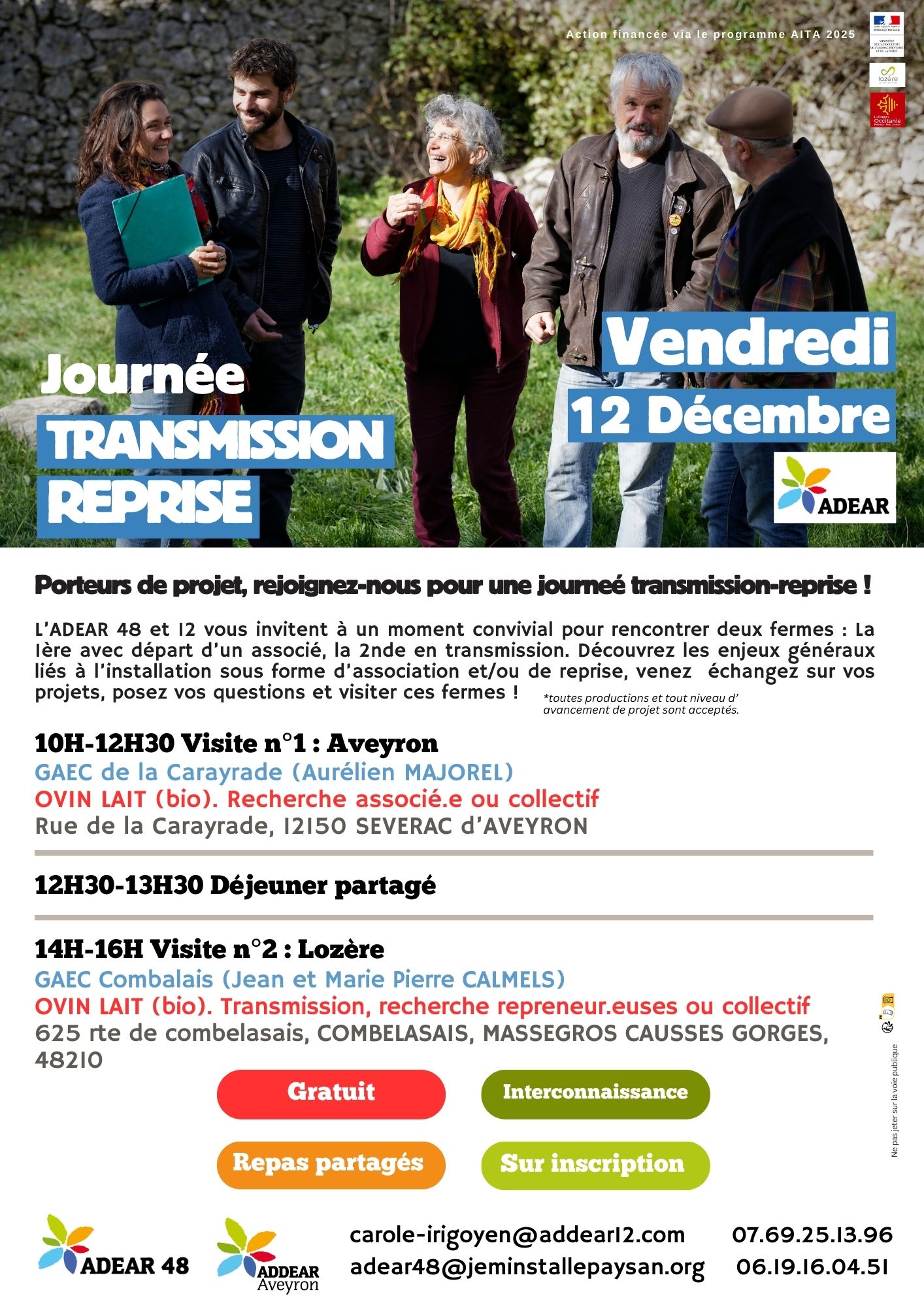 L’ADEAR 48 et l’ADEAR 12 ont le plaisir de vous inviter à une journée conviviale dédiée à la transmission et à la reprise de fermes. Venez rencontrer deux exploitations en recherche d’associé·e·s ou de repreneur·euses, découvrir leurs réalités, échanger sur vos projets et poser toutes vos questions.