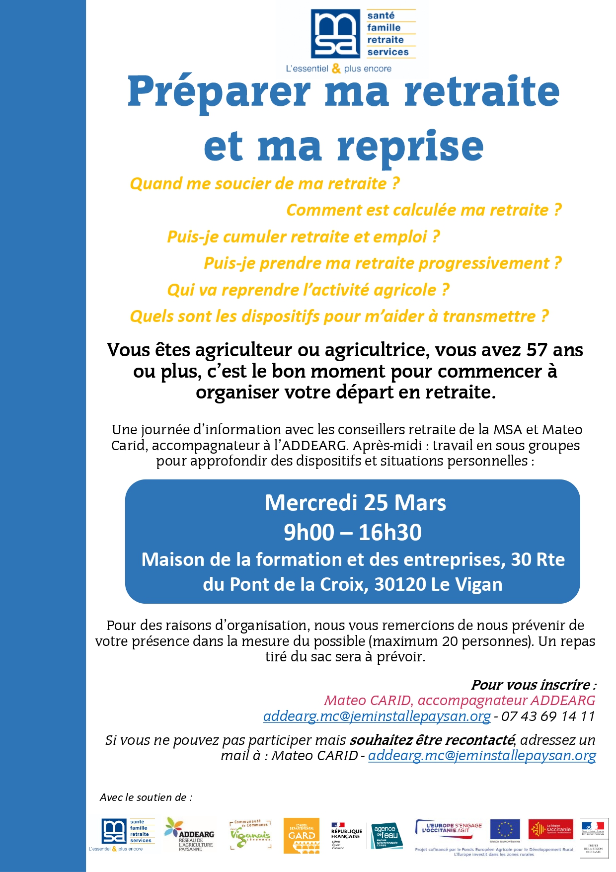 L’Addearg vous invite le 25 Mars, à une journée d’information co-organisée avec les conseillers de la MSA et avec Mateo Carid, accompagnateur à l’Addearg dans le cadre du PAT de la communauté de commune du Pays Viganais.