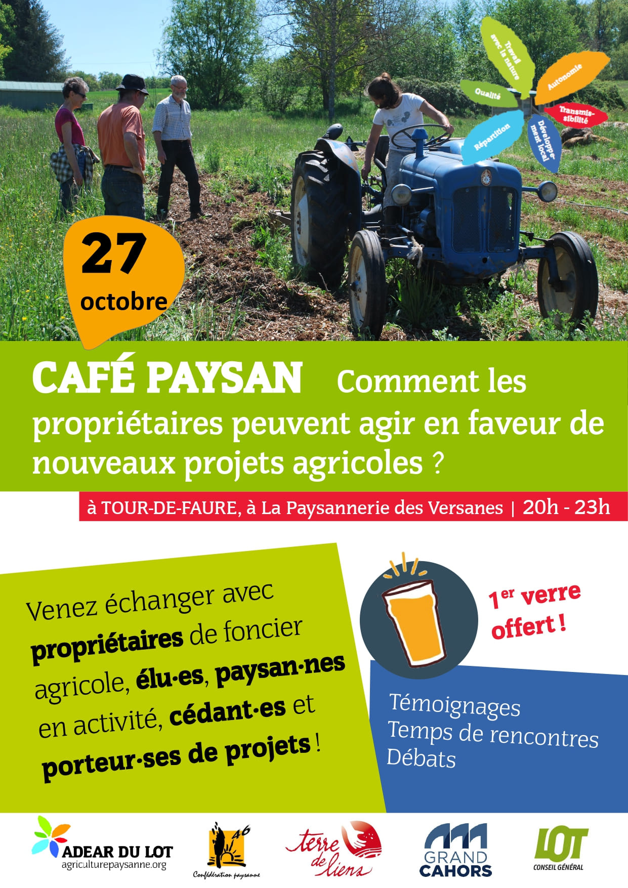 Venez participer à un café paysan, temps d'échange convivial sur le thème du foncier agricole, le 27 octobre à 20h à la Paysannerie des Versanes (Tour de Faure, 46330) ! Les propriétaires de foncier agricole - qui le deviennent généralement par héritage - sont de plus en plus nombreux à se poser la question de l'avenir et de l'usage de leurs terres. Comment favoriser la création d'emploi, la relocalisation et la diversification des productions agricoles ? Les collectivités locales ont aussi un rôle à jouer pour mobiliser les propriétaires dans le cadre de leurs projets de territoire et/ou pour répondre à des enjeux d'aménagement (ex : lutte contre les incendies). Cette soirée s'adresse aux élu·es locaux, aux propriétaires, aux paysan·nes, aux porteur·ses de projets et aux curieux et curieuses du monde paysan. La rencontre sera co-animée par : - ADEAR du Lot : L'Association pour le Développement de l’Emploi Agricole et Rural a été créée il y a une vingtaine d’années par des paysannes et des paysans soucieux de développer une agriculture durable. L’ADEAR travaille au développement de l’Agriculture paysanne, par l'accompagnement à l'installation, à la transmission des fermes et par la formation technique des paysans. - Terre de Liens : mouvement citoyen proposant des outils pour la mise en relation entre l'offre et la demande de foncier (www.objectif-terres.org), l'accompagnement des propriétaires et des collectivités. Terre de Liens vient d'éditer un guide de la propriété foncière agricole responsable : https://ressources.terredeliens.org/les-ressources/guide-de-la-propriete-fonciere-responsable - Confédération paysanne du Lot : syndicat agricole qui défend un modèle d'agriculture paysanne, pour des paysannes et paysans nombreux dans des campagnes vivantes.
