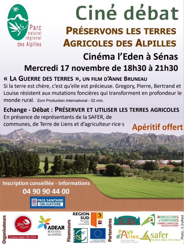 l'ADEAR13 co-organise avec le Parc Naturel Régional des Alpilles et Terre de Liens PACA une soirée Ciné Débat avec la projection du film "La Guerre des Terres" d'Anne Bruneau le Mercredi 17 novembre à 18h30 : Le film sera suivi d'un temps d'échange-débat avec des représentants de la SAFER, de communes, de Terre de Liens et d'agriculteur.ices. Un apéritif permettra de poursuivre les échanges.