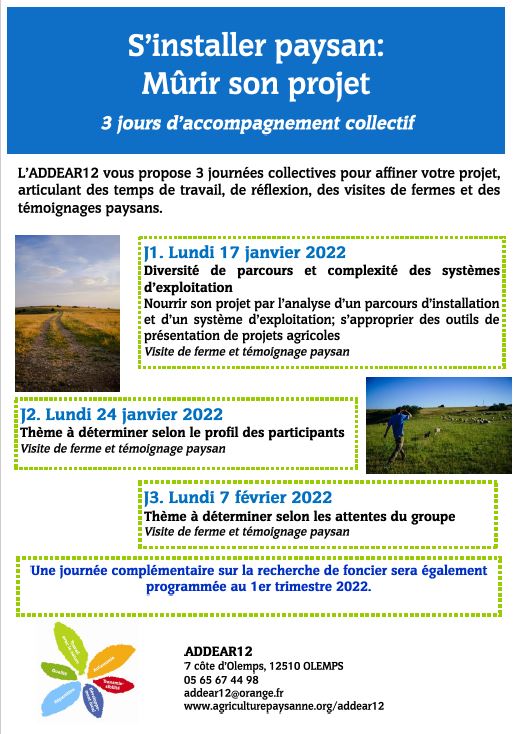 L'ADDEAR12 vous propose 3 journées collectives pour affiner votre projet, articulant des temps de travail, de réflexion, des visites de fermes et des témoignages paysans.