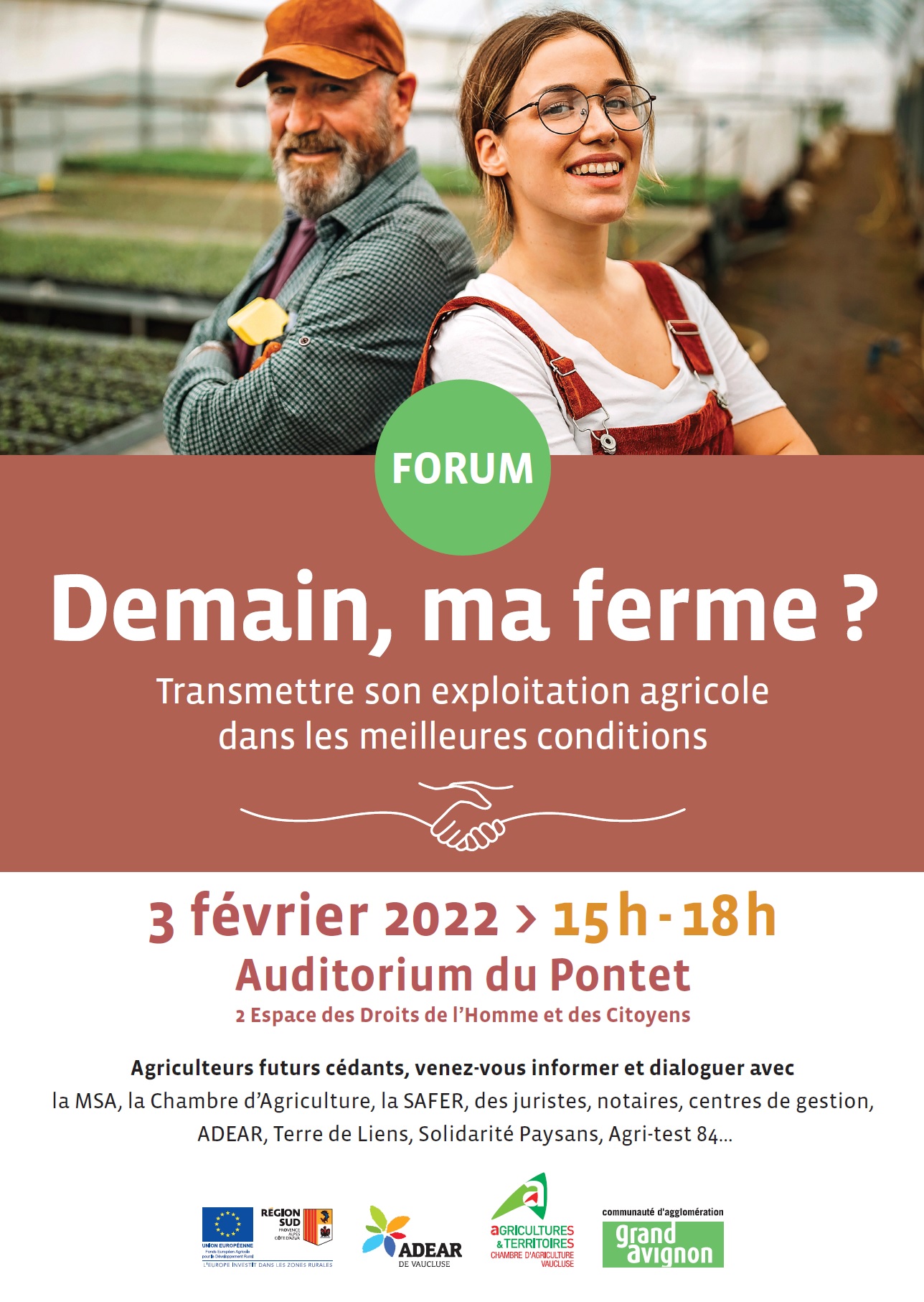Différentes organisations agricoles seront présentes pour vous informer ou dialoguer avec vous : MSA, Chambre d'Agriculture, ADEAR, SAFER, juriste, centre de gestion, Terre de Liens, Agri-test 84, Initiative Sud...