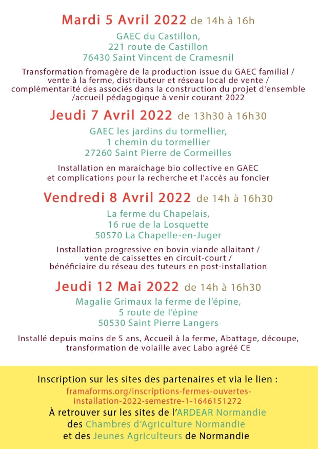 Organisées par Ardear Normandie (07/04), Jeunes Agriculteurs de Normandie (05/04 et 08/04) et Chambres d’agriculture de Normandie (12/05) dans le cadre des Contrats d’Objectifs de la Région Normandie.