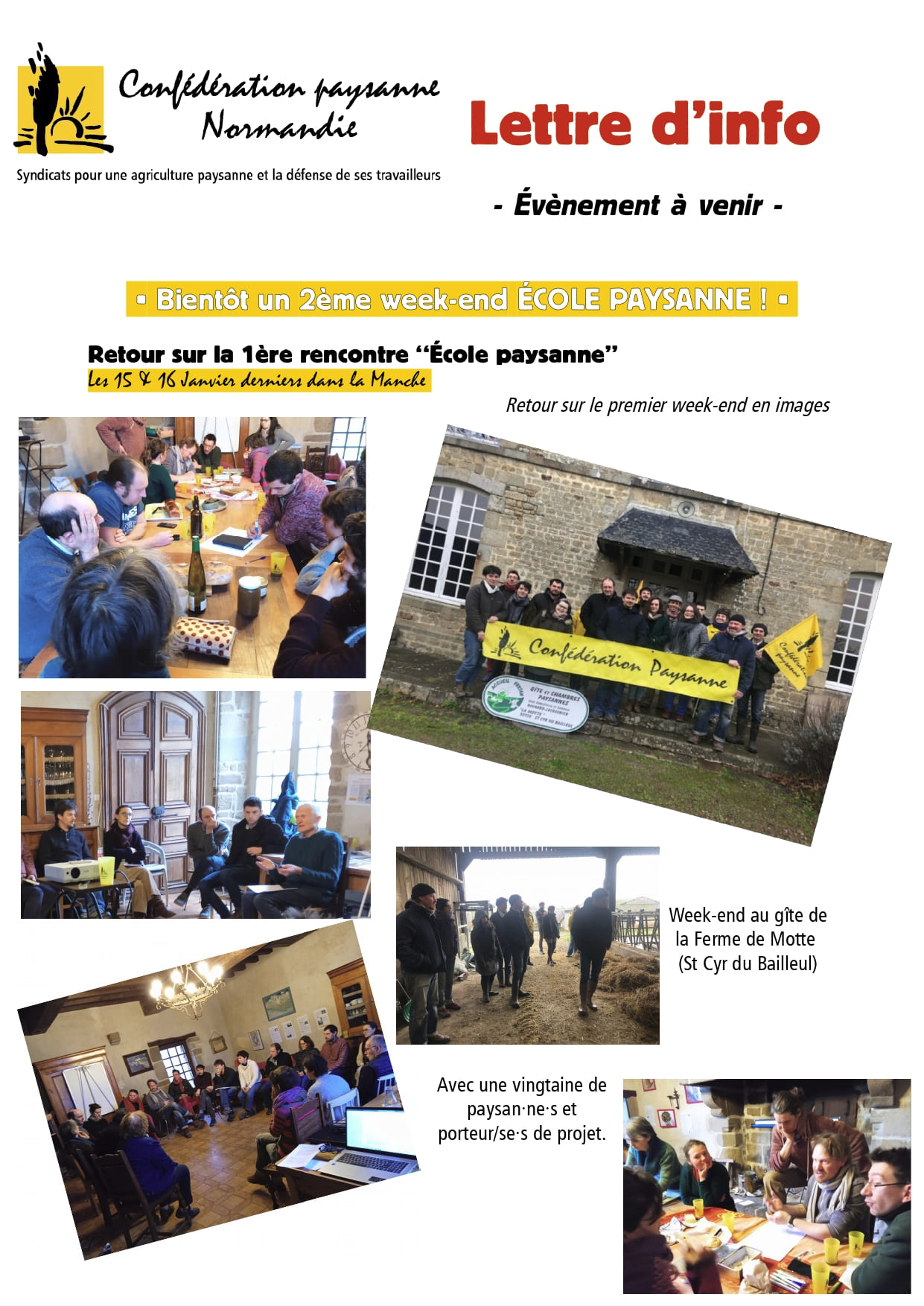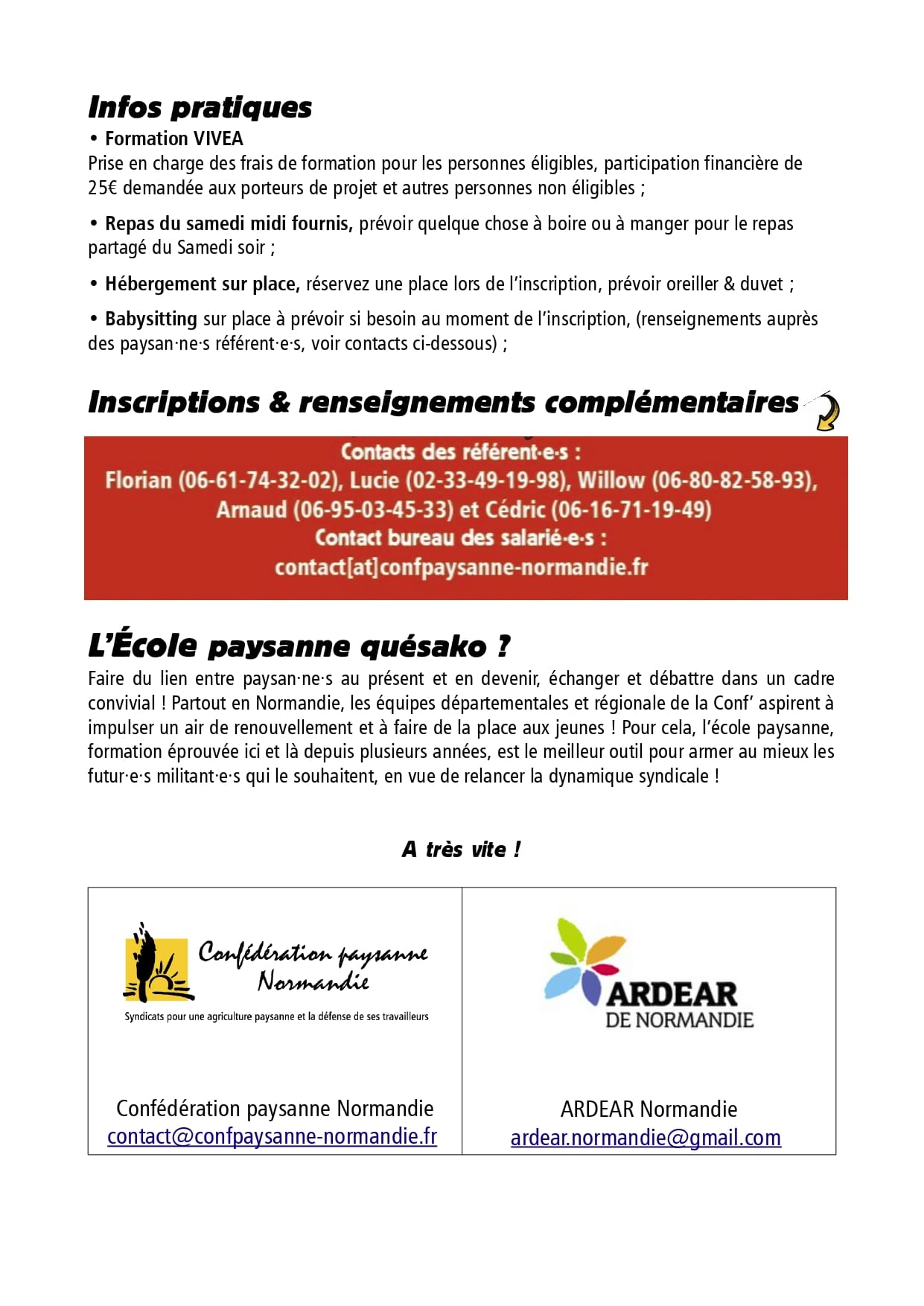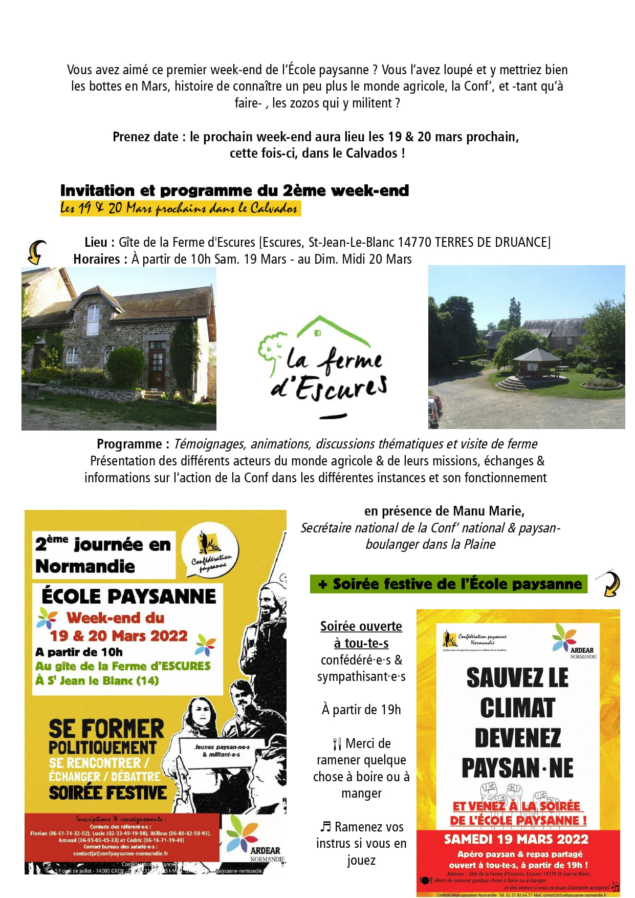 Faire du lien entre paysan.nes au présent et en devenir, échanger et débattre dans un cadre convivial ! Partout en Normandie, les équipes départementales et régionales de la Conf' aspirent à impulser un air de renouvellement et à faire de la place aux jeunes ! Pour cela, l'école paysanne, formation éprouvée ici et là depuis plusieurs années, est le meilleur outil pour armer au mieux les futur.es militant.es qui le souhaitent, en vue de relancer la dynamique syndicale !