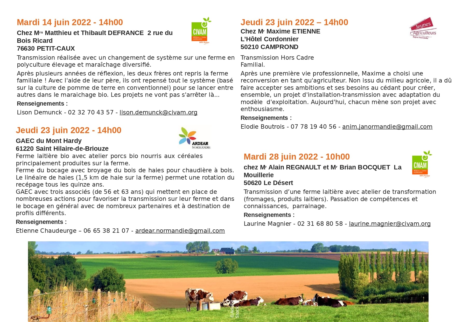 * Mardi 28 Juin à 10h à l'EARL La Belle Eau, Le Désert (50) : Alain (cédant) et Brian (repreneur) témoignent de leurs parcours et projets - Réseau des Civam Normands - Antenne de Vassy
