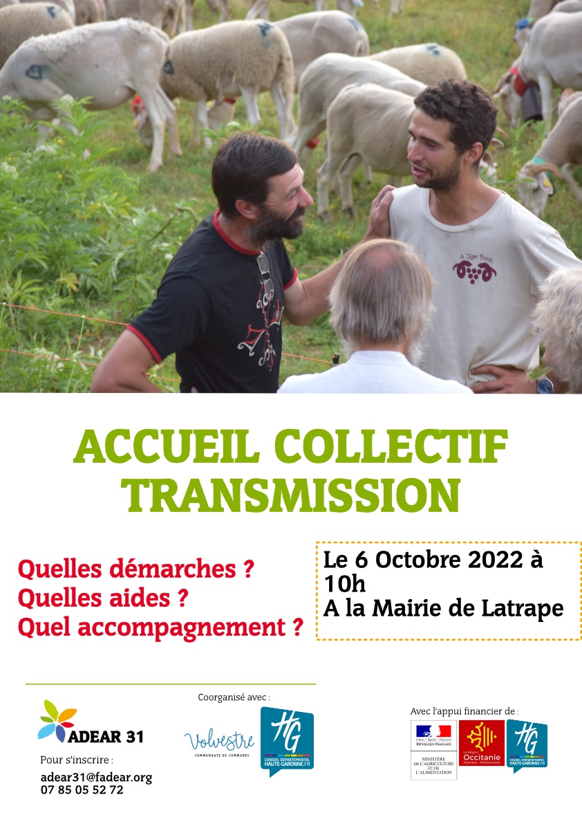 L'ADEAR 31 organise une réunion d’information le 6 Octobre prochain à 10h à la mairie de Latrape. Nous vous présenterons les différentes étapes de la transmission d’une ferme, les aides qu’il est possible de déclencher à cette occasion, et l’accompagnement que nous pourrions vous proposer.