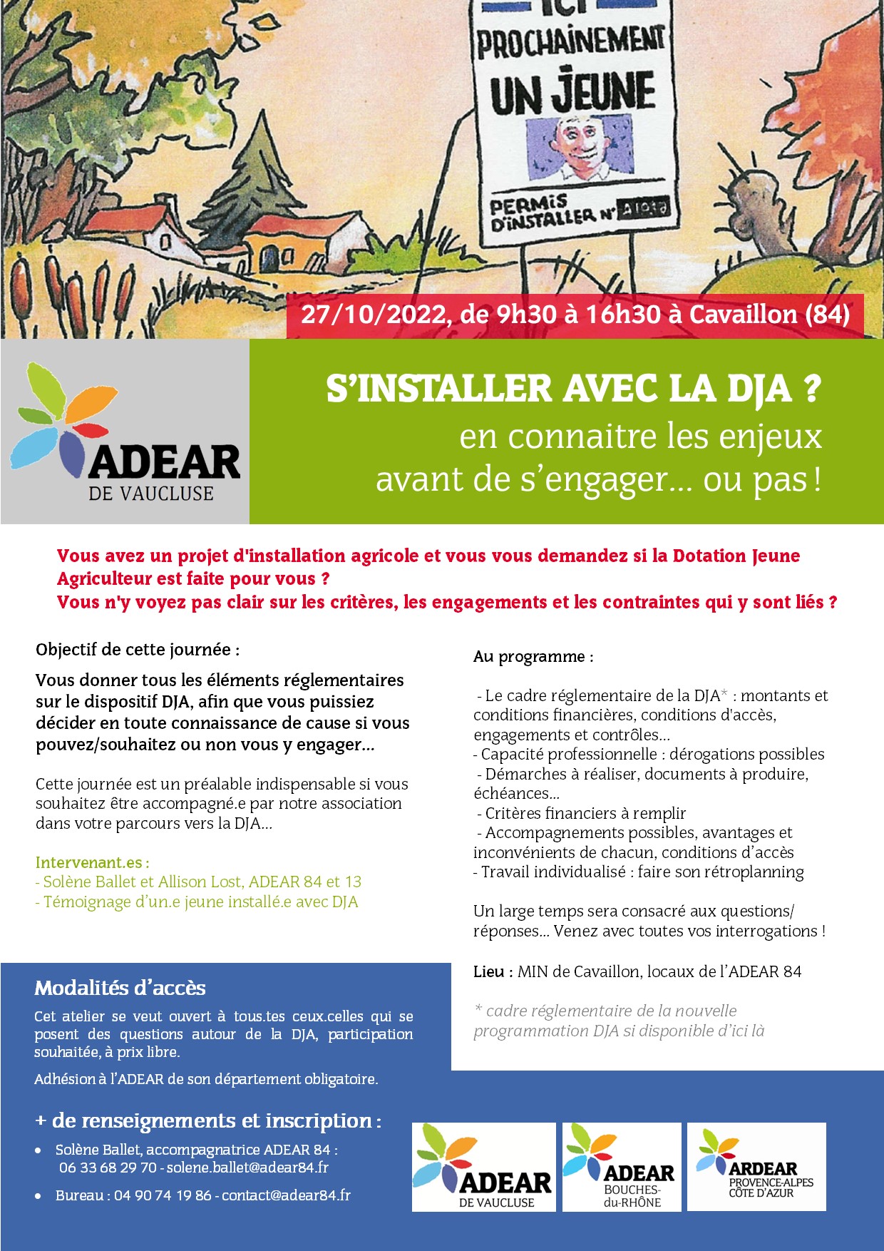 Vous avez un projet d'installation agricole et vous vous demandez si la Dotation Jeune Agriculteur est faite pour vous ? Vous n'y voyez pas clair sur les critères, les engagements et les contraintes qui y sont liés ? Objectif de cette journée : Vous donner tous les éléments réglementaires sur le dispositif DJA, afin que vous puissiez décider en toute connaissance de cause si vous pouvez/souhaitez ou non vous y engager… Cette journée est aussi un bon préalable si vous souhaitez être accompagné.e par notre association dans votre parcours vers la DJA... Au programme : - Le cadre réglementaire de la DJA* : montants et conditions financières, conditions d'accès, engagements et contrôles... - Conditions d'acquisition de la capacité professionnelle, dérogations possibles - Démarches à réaliser, documents à produire, échéances... - Critères financiers à remplir - Accompagnements possibles, avantages et inconvénients de chacun - Travail individualisé : faire son rétroplanning Un large temps sera consacré aux questions/réponses... Venez avec toutes vos interrogations ! Intervenant.es : - Solène Ballet et Allison Lost, ADEAR 84 et 13 - Un.e jeune installé.e avec la DJA (sous réserve) Lieu : MIN de Cavaillon, locaux de l’ADEAR 84 Modalités d’accès : Cet atelier se veut ouvert à tous.tes ceux.celles qui se posent des questions autour de la DJA. Participation souhaitée, à prix libre. Adhésion à l’ADEAR de son département obligatoire. + de renseignements et inscription : Solène Ballet, accompagnatrice ADEAR 84 : 06 33 68 29 70 - solene.ballet@adear84.fr * Le cadre réglementaire présenté sera celui en vigueur le jour de l'atelier. Il sera actualisé en fonction de la date de parution de la nouvelle programmation européenne et régionale, qui conditionne l'accès et finance la DJA.