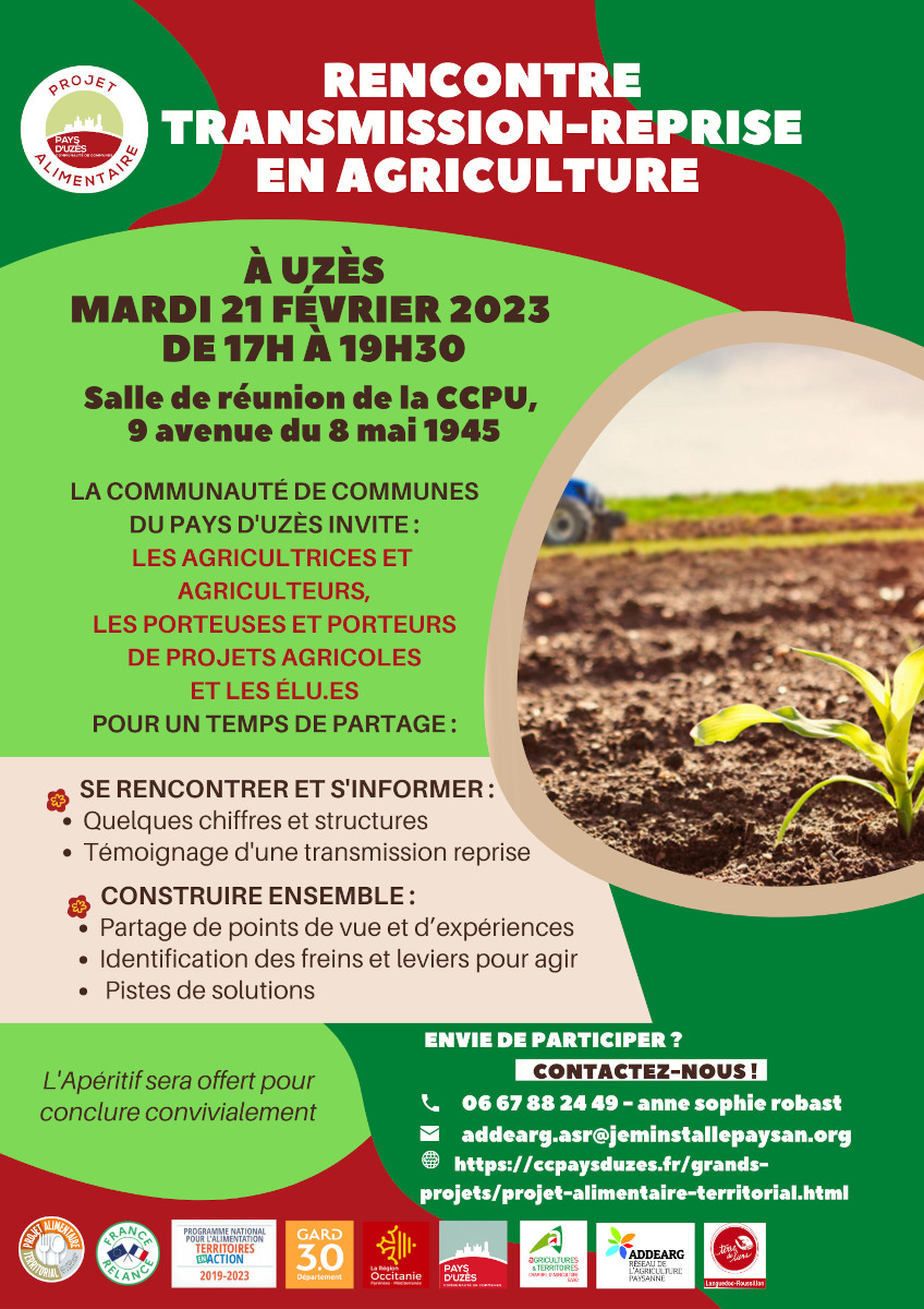 La communauté de communes du Pays de l’Uzège en partenariat avec l’Addearg organise une rencontre sur la transmission-reprise à destination des agriculteurs et agricultrices, des porteurs et porteuses de projet agricole et des élu.es du territoire pour échanger sur ce thème.
