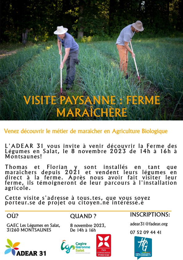 Venez découvrir la ferme de deux maraichers récemment installés en maraîchage AB et en vente directe. Cette visite sera l'occasion d'échanger avec eux sur leur installation, leur vécu et leur organisation actuelle. De 14h à 15h30 à Montsaunes Inscription obligatoire par mail : adear31@fadear.org