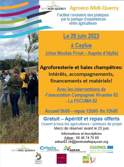 Les ateliers du projet Agroéco Midi-Quercy reprennent ! Retrouvez-nous pour une journée « Plantations champêtres agricoles : intérêt, accompagnements, financements et matériel » ! Le 29 Juin 2023 à Caylus à partir de 9h00.