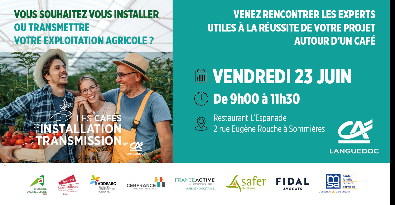Pour donner vie à votre projet, le Crédit Agricole du Languedoc et ses partenaires vous invitent à un rendez-vous convivial autour d’un café, avec les experts du monde Agri-Local, référents dans le domaine de l’installation et de la transmission.
