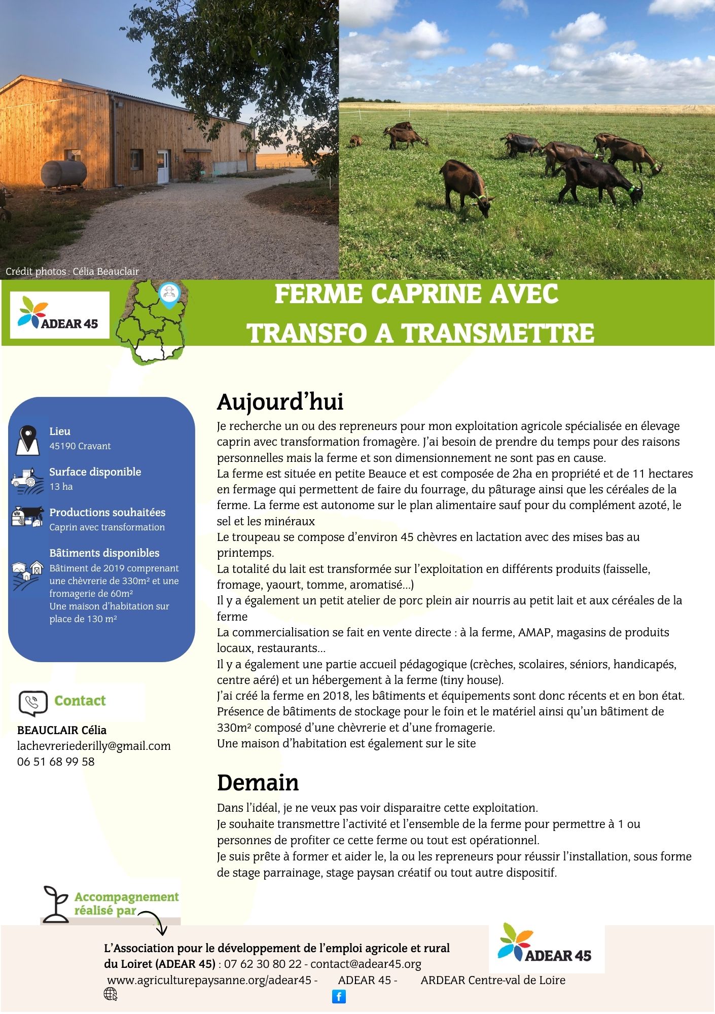 Je recherche un ou des repreneurs pour mon exploitation agricole spécialisée en élevage caprin avec transformation fromagère. J’ai besoin de prendre du temps pour des raisons personnelles mais la ferme et son dimensionnement ne sont pas en cause.