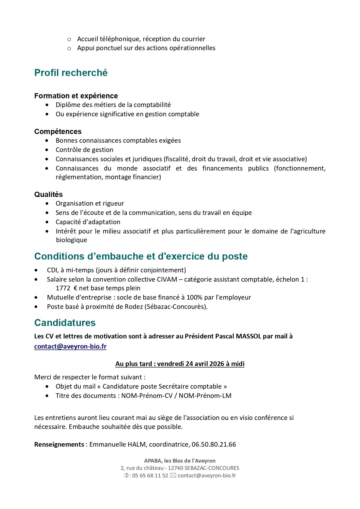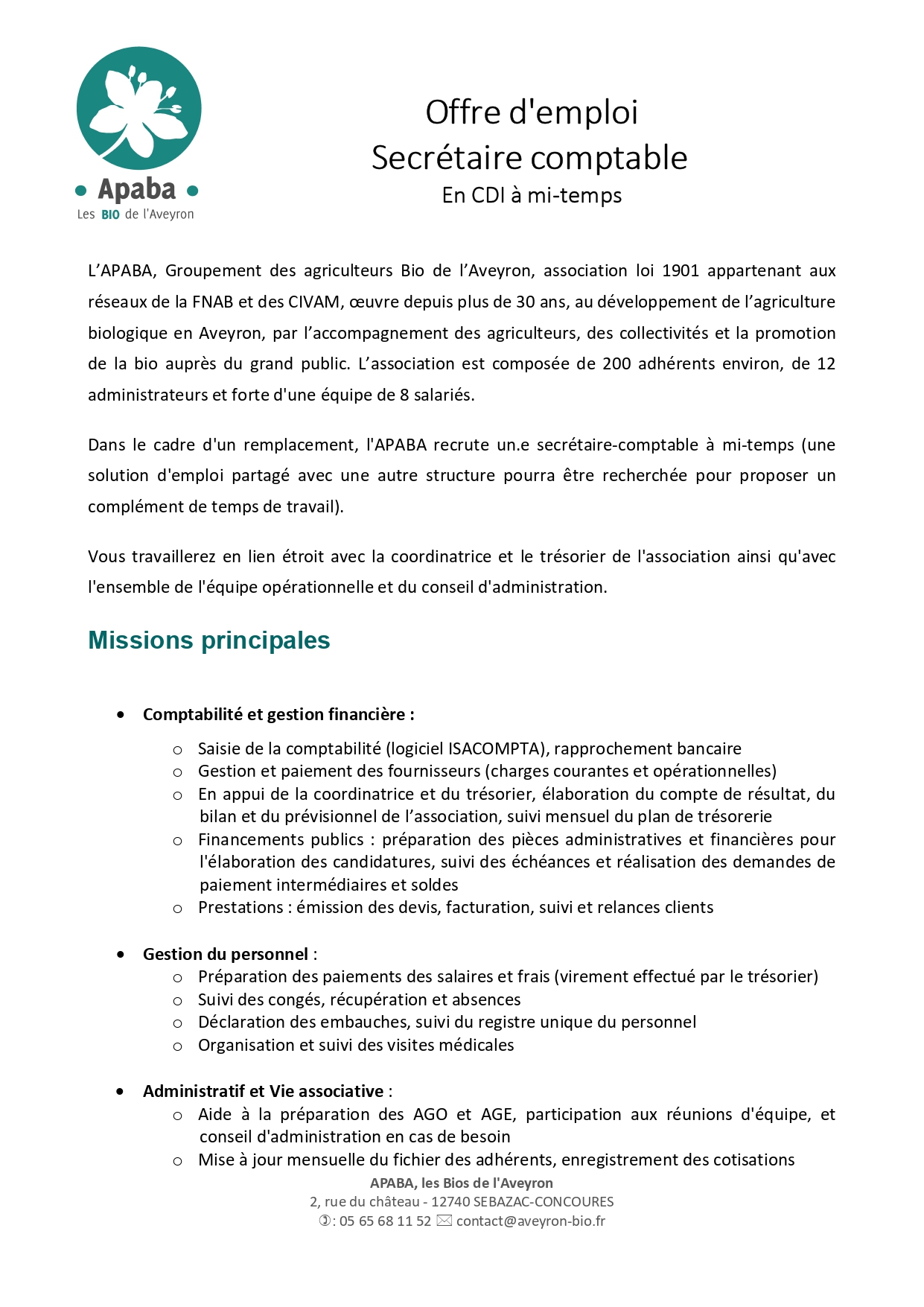 Dans le cadre d'un remplacement, l'APABA recrute dès que possible un.e secrétaire comptable à mi-temps.