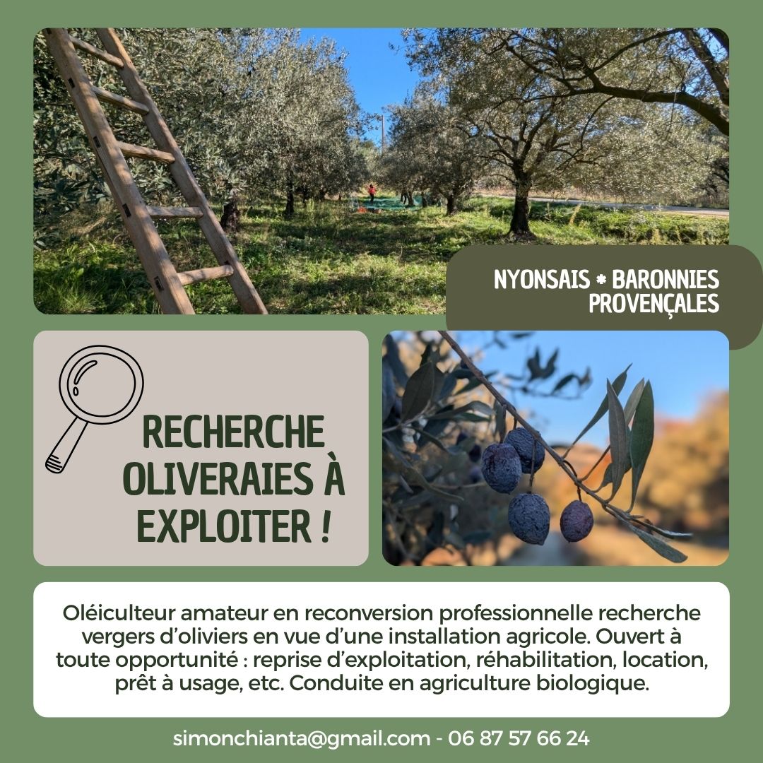 Bonjour, oléiculteur amateur dans le sud Drôme je suis en reconversion professionnelle et recherche des vergers d'oliviers pour mener à bien mon projet d'installation. Ouvert à toute opportunité : oliviers en production ou à réhabiliter, location, commodat, etc. Merci par avance