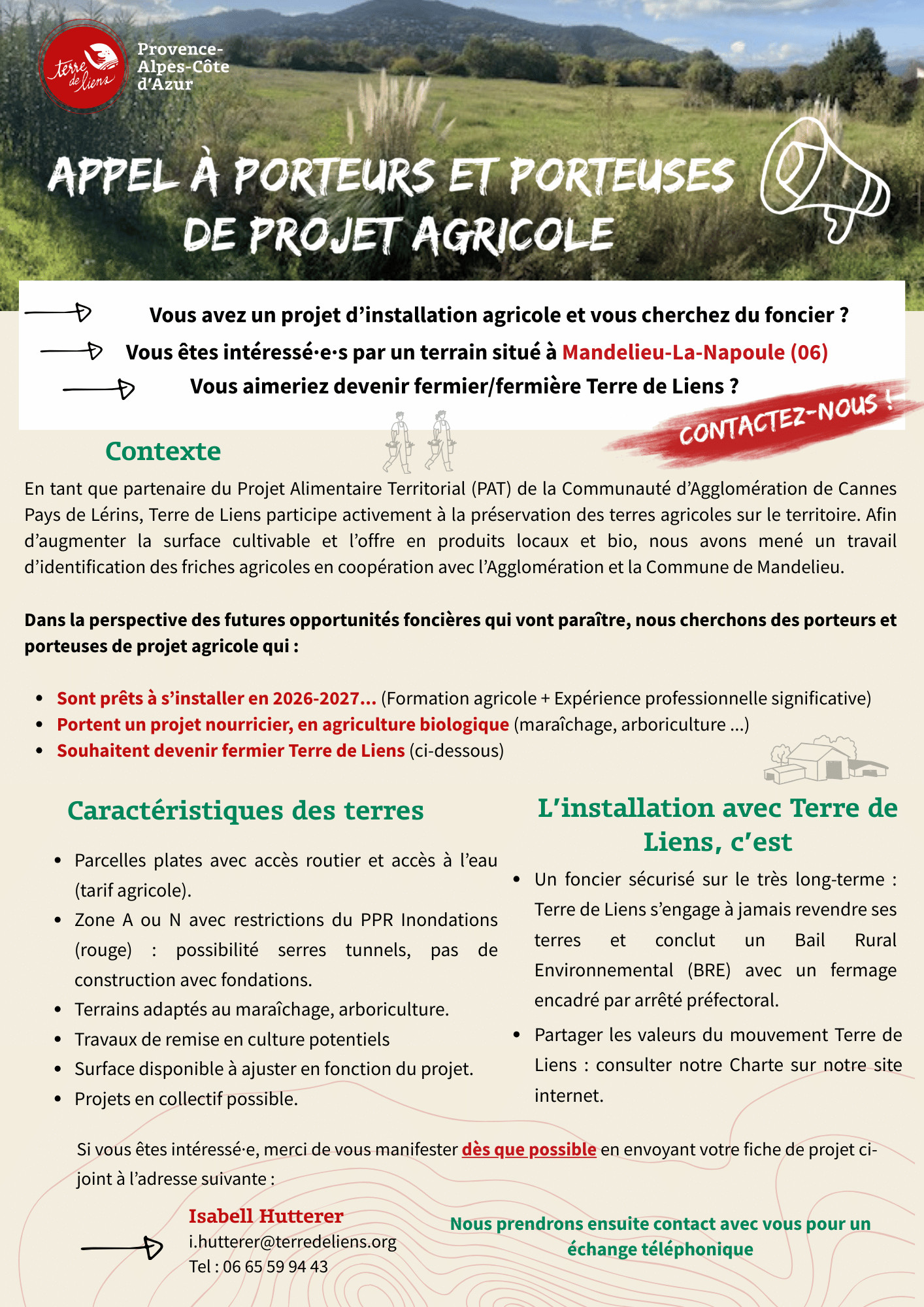 Terre de Liens PACA lance un appel à manifestation d'intérêt à destination de porteurs et porteuses de projet agricole intéressé·e·s par un terrain dans la Basse Vallée de la Siagne à Mandelieu-la-Napoule (06). Dans le cadre d'un travail mené avec la collectivité et son PAT et dans la(...)