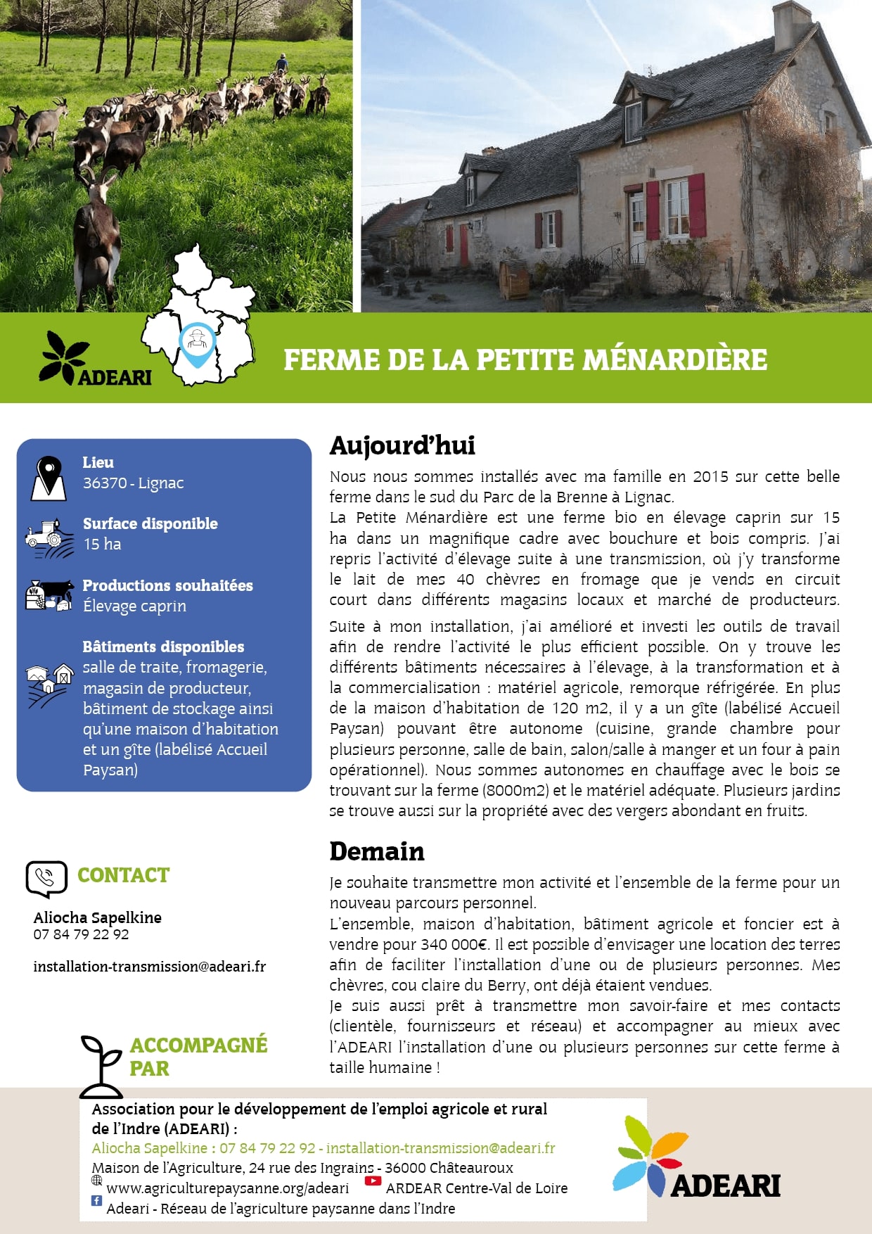 Nous nous sommes installés avec ma famille en 2015 sur cette belle ferme dans le sud du Parc de la Brenne à Lignac. La Petite Ménardière est une ferme bio en élevage caprin sur 15 ha dans un magnifique cadre avec bouchure et bois compris. J’ai repris l’activité d’élevage suite à une(...)